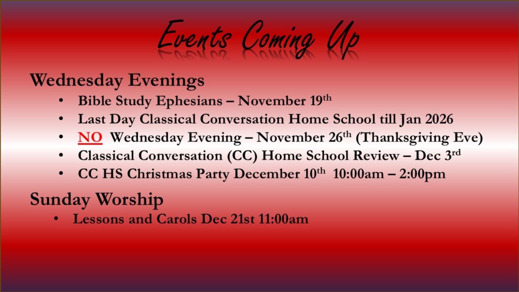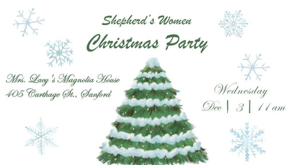 Women’s Christmas Party – Enjoy the fun. Wednesday, December 3, 11 am at Mrs. Lacy’s Magnolia House